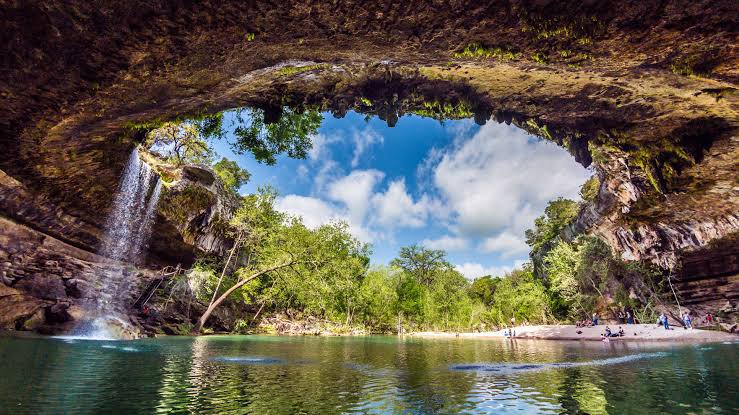 Hamilton Pool Preserve is a historic swimming hole which was designated a preserve by the Travis County Commissioner’s Court in 1990. Located 3/4 mile upstream from its confluence with the Pedernales River, Hamilton Creek spills out over limestone outcroppings to create a 50 foot waterfall as it plunges into the head of a steep box canyon. The waterfall never completely dries up, but in dry times it does slow to a trickle. However, the pool’s water level stays pretty constant, even during periods of drought.